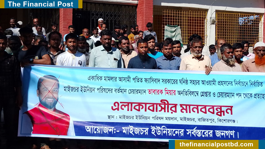 Residents of Maizchar Union in Bajitpur upazila of Kishoreganj formed a human chain demanding the removal and arrest of Union Parishad Chairman Tabarak Mia.